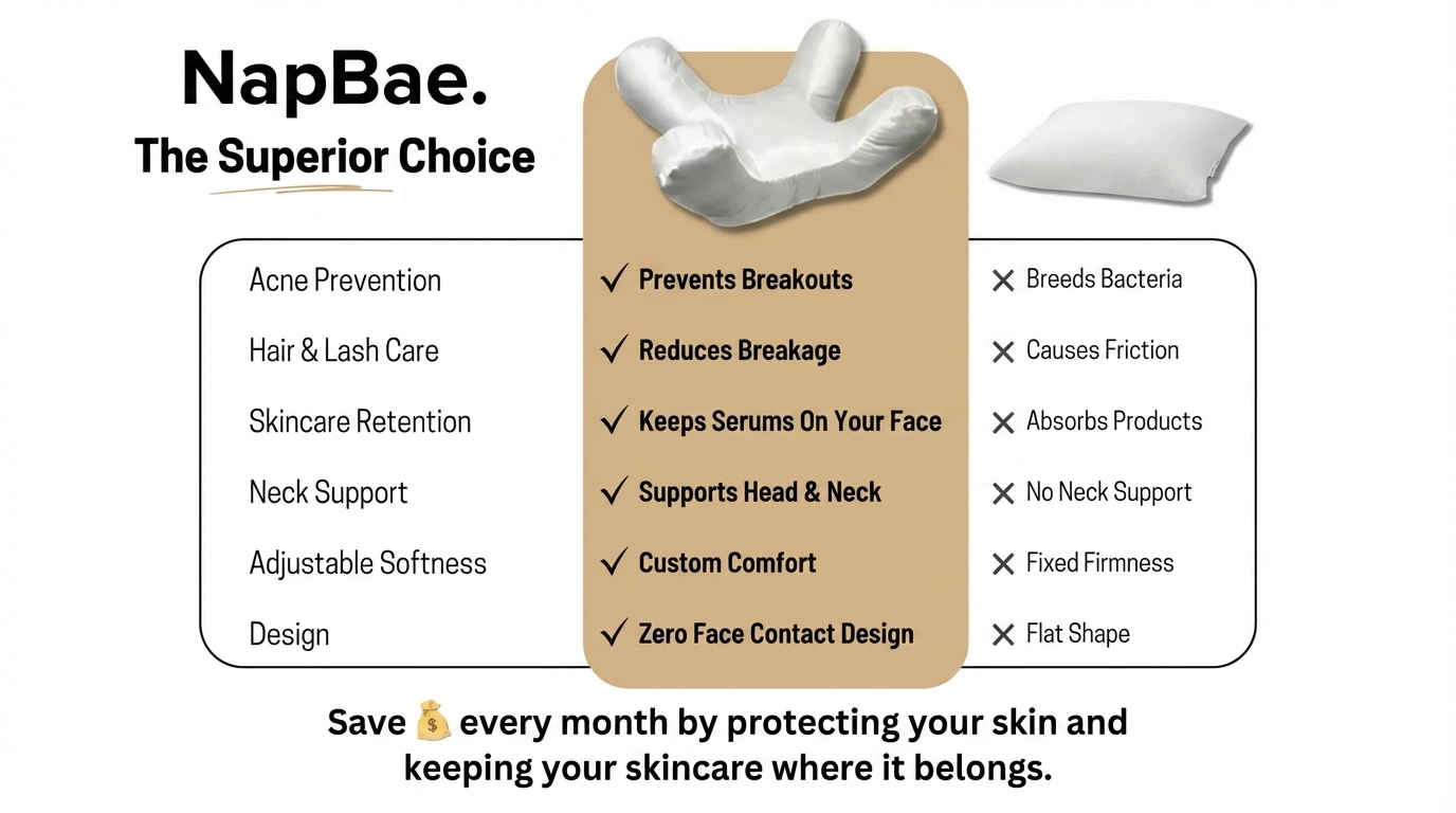 The difference: Regular pillows add compression ON TOP of gravity, creating creases and puffiness. NapBae eliminates that harmful compression while your face rests in its normal position.