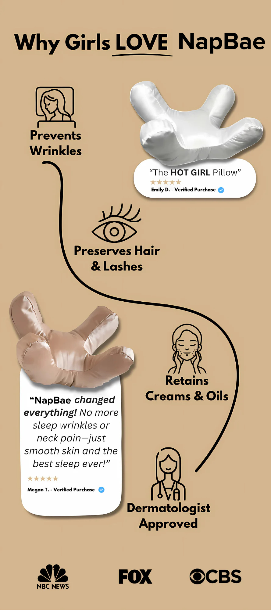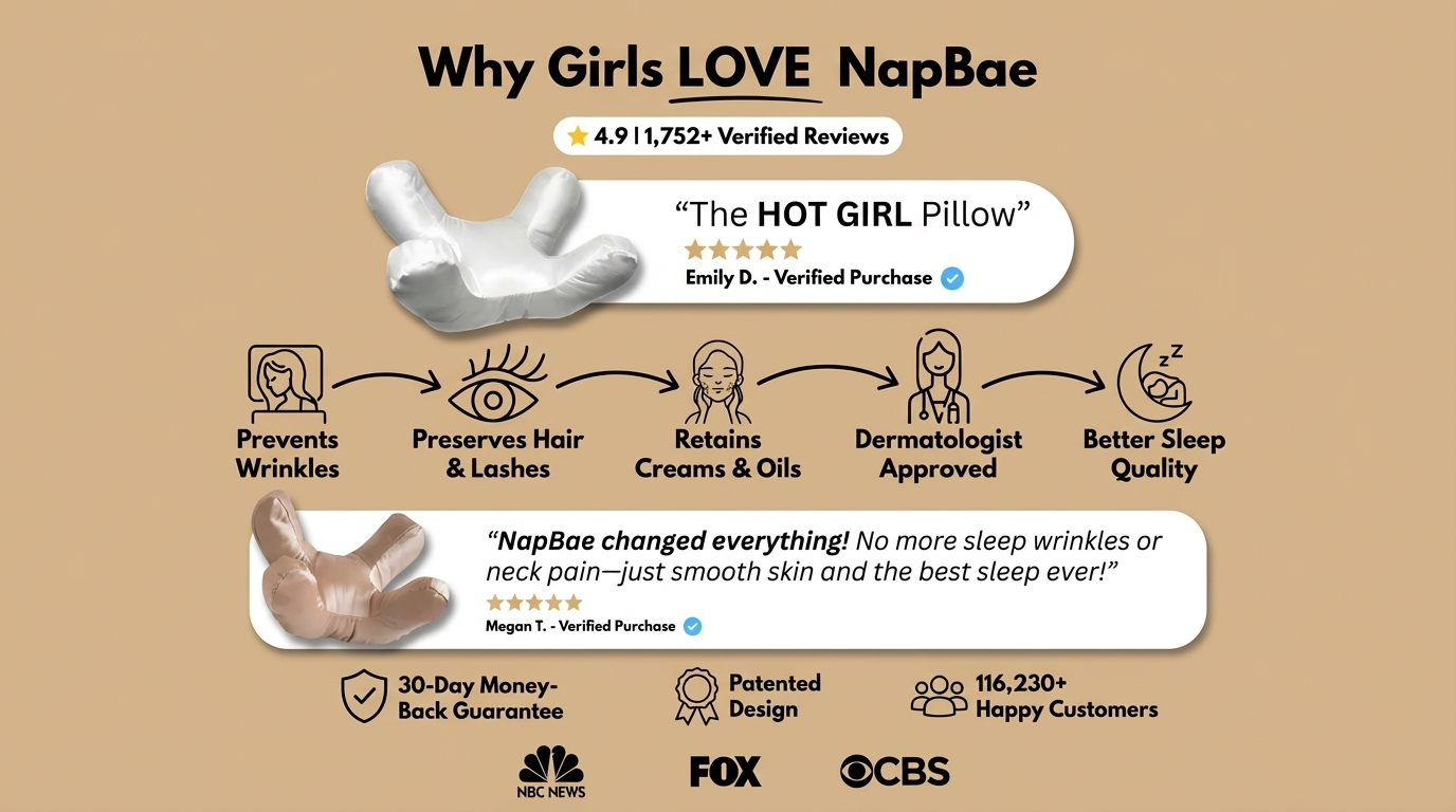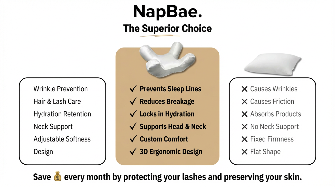 The difference: Regular pillows add compression ON TOP of gravity, creating creases and puffiness. NapBae eliminates that harmful compression while your face rests in its normal position.